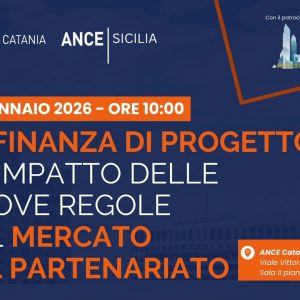 ANCE Catania e ANCE Sicilia organizzano l’evento “La finanza di progetto e l’impatto delle nuove regole sul mercato del partenariato” che si terrà presso la sede di ANCE Catania, Viale Vittorio Veneto 109, il 30 gennaio 2026 alle ore 10:00.