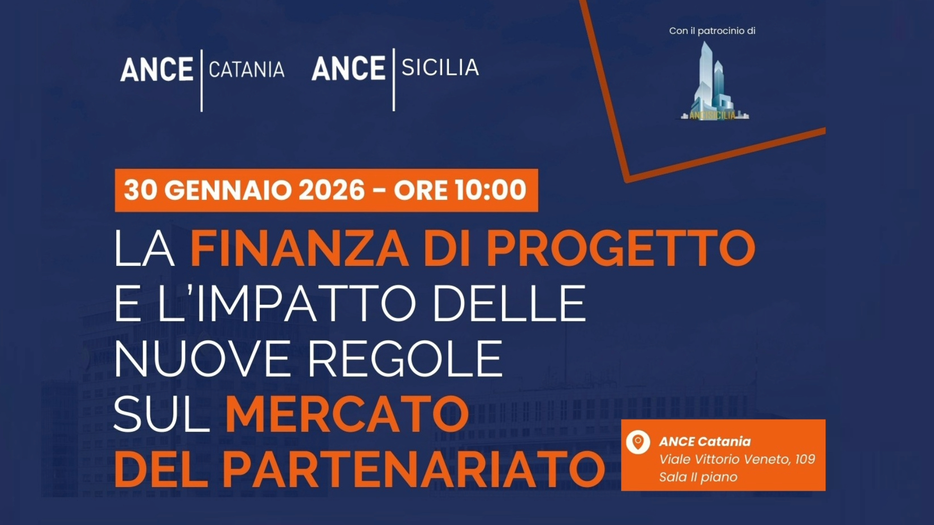 ANCE Catania e ANCE Sicilia organizzano l’evento “La finanza di progetto e l’impatto delle nuove regole sul mercato del partenariato” che si terrà la sede di ANCE Catania, Viale Vittorio Veneto 109, il 30 gennaio 2026 alle ore 10:00.
